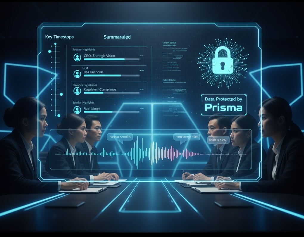 Prisma converts audio into text using speech-to-text, then summarizes or analyzes the content.