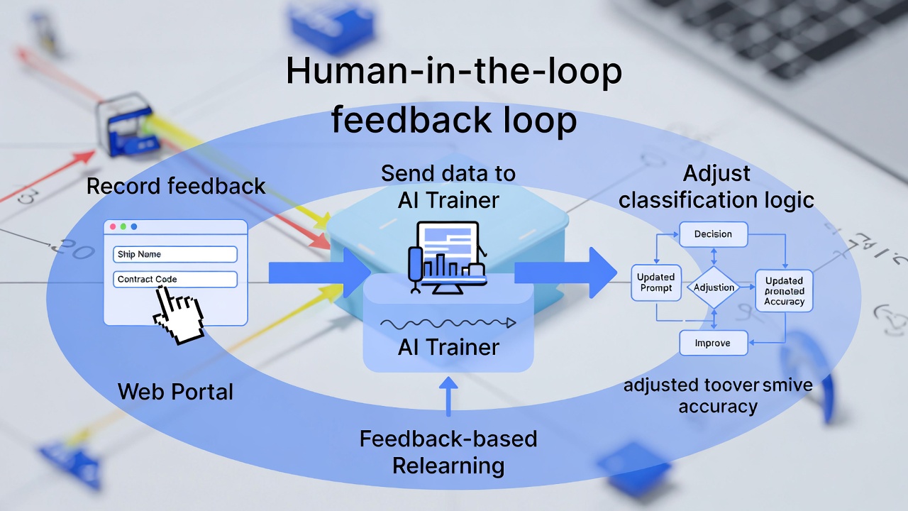 • Feedback Recording: When users make manual label edits (e.g., correcting ship names or contract codes) on the Web Portal, the system meticulously records these edits.